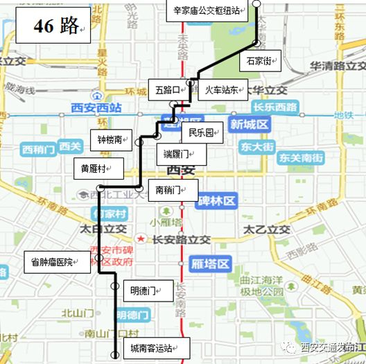 46路由城南客运站发车,经朱雀大街、青松路、含光路、友谊路、长安路、南大街、东大街、南新街、东新街、尚德路(解放路)、东五路、尚勤路、环城北路、太华路、含元路、东二环至矿山路公交枢纽站。再由矿山路公交枢纽站经东二环延伸至辛家庙公交枢纽站。