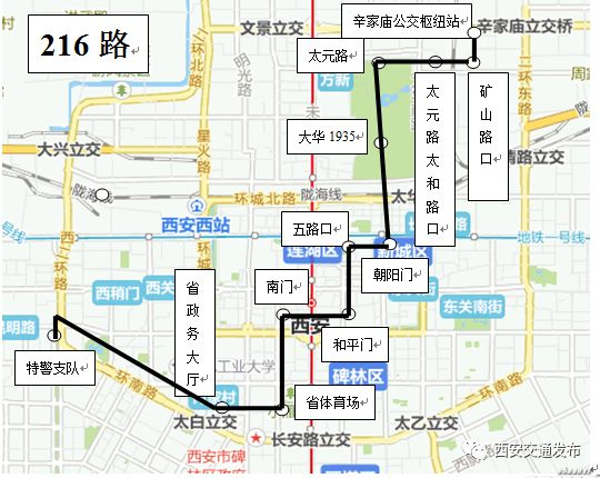 216路由特警支队发车,经沣惠南路(唐延路)、南二环、长安路、环城南路、和平路、解放路、东五路、环城东路、太华路至太华路•含元路口后,再由太华路向北经太元路、东二环至辛家庙公交枢纽站。