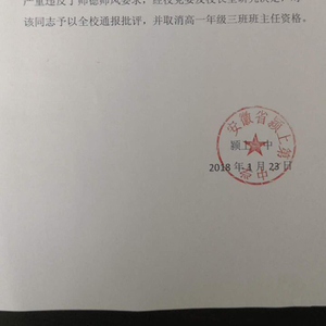 两个小时内,学校印发文件:对林仁波予以全校通报批评,取消其高一年级三班班主任资格。1月25日下午,校方一名工作人员向澎湃新闻(www.thepaper.cn)记者指出,作为教师,不应该在微信群里说脏字,“你要求学生不要骂人、不要说脏话,那你老师在一个公共的大群里说脏话也是不对的”。