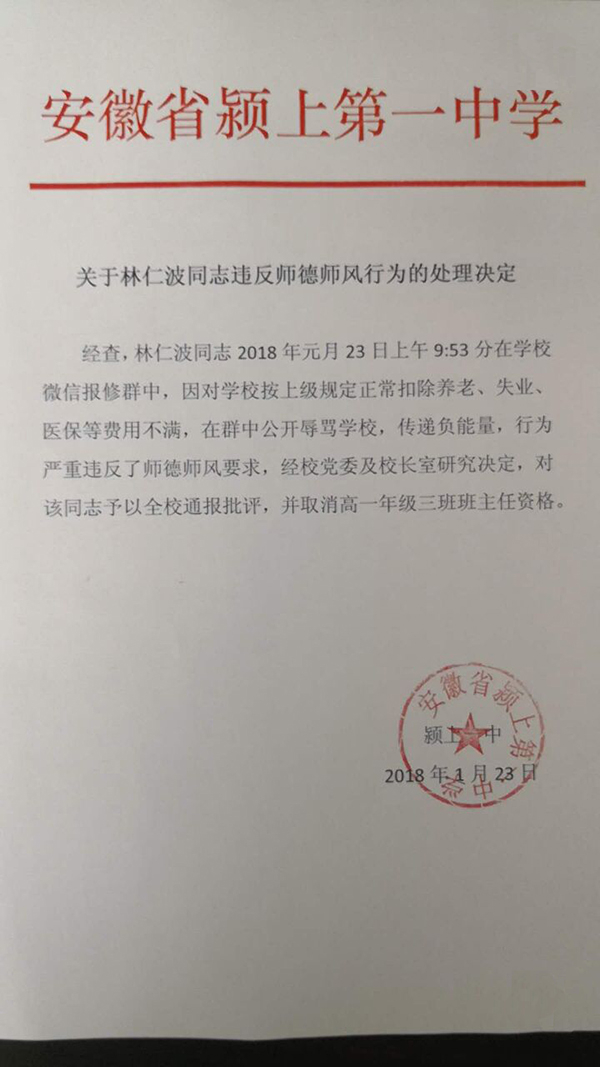 这份名为《关于林仁波同志违反师德师风行为的处理决定》指出,经查,林仁波同志2018年元月23日上午9:53分在学校微信报修群中,因对学校按上级规定正常扣除养老、事业、医保等费用不满,在群中公开辱骂学校,传递负能量,行为严重违反了师德师风要求。经校党委及校长室研究决定,对该同志予以全校通报批评,并取消高一年级三班班主任资格。