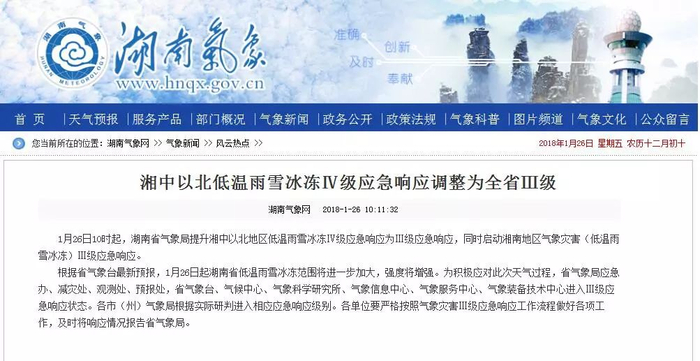 今日10时起,湖南省气象局提升湘中以北地区低温雨雪冰冻Ⅳ级应急响应为Ⅲ级应急响应,同时启动湘南地区气象灾害(低温雨雪冰冻)Ⅲ级应急响应。
