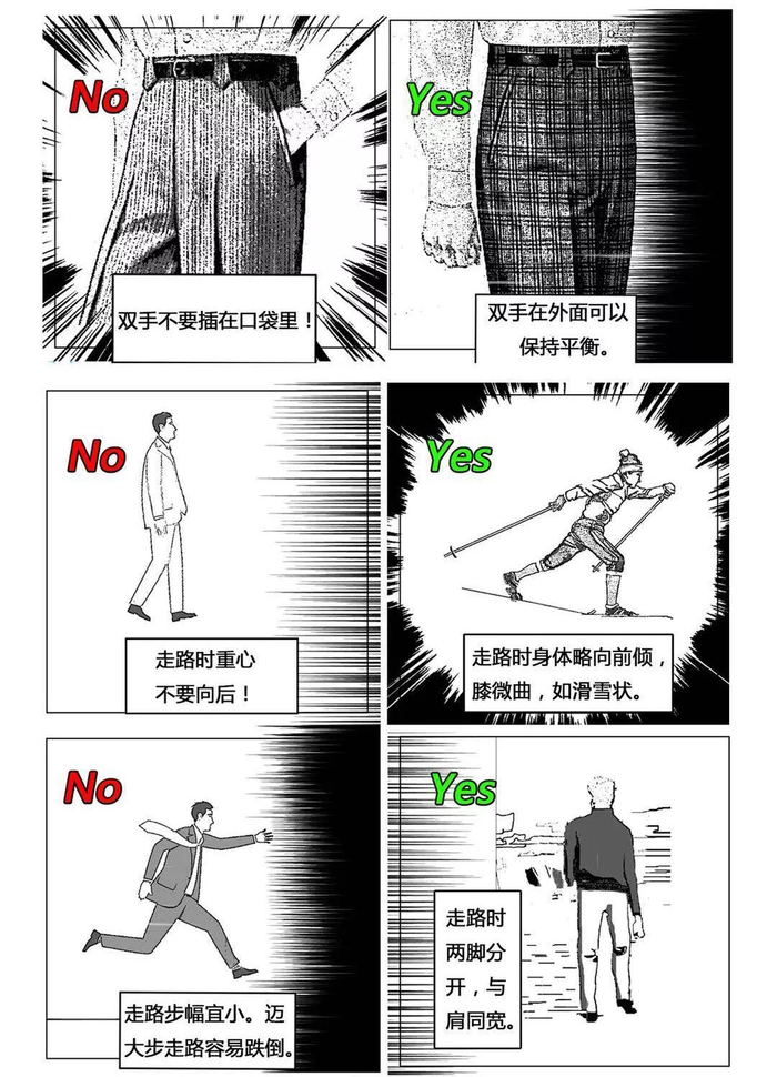 技巧3:“企鹅步”不易摔倒小步走比大步走防滑效果好;慢慢走比快步走防滑效果好;走路时双手来回摆动,比双手插进口袋或者抱拢更能起到平衡和防止摔倒的作用。