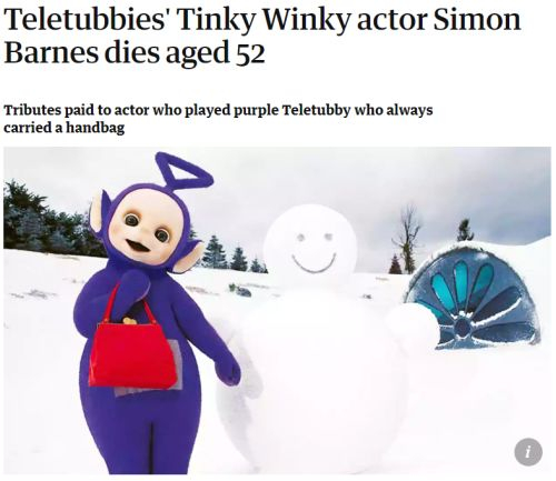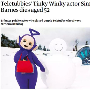 动画片天线宝宝中,扮演“丁丁”(Tinky Winky)的英国演员西蒙·巴恩斯(Simon Barnes)去世,享年52岁。