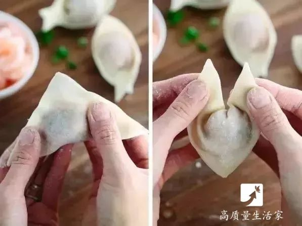 将两边的皮捏紧向中间叠在一起,粘牢以后就成了一个圆馄饨啦!