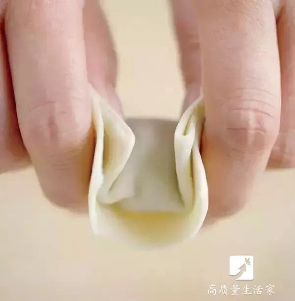 把皮两边压紧向馅中间包起来,让两边的皮粘在馄饨上。