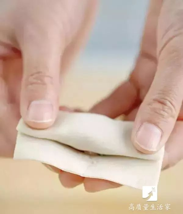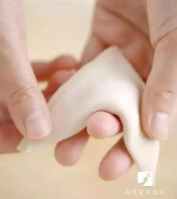 将两边的角顺着手指向里折,并将两个角完全重叠粘牢,像猫耳朵的馄饨超可爱!