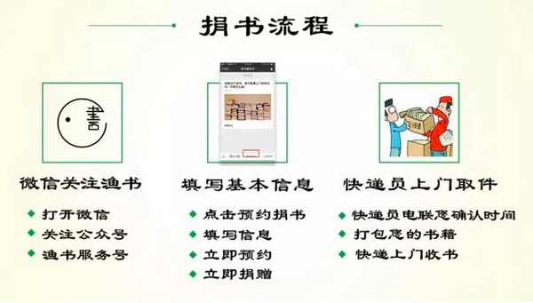 1月25日,一篇《渔书免费上门收取,环保+公益,全国开通啦!》吸引了许多人关注。二手图书循环共享平台“渔书”和京东物流合作,在全国300多个城市开通了免费上门收书服务。想要“处理旧书”的书友只需预约便有快递上门,运费还由渔书支付。