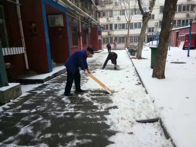 (劳动一坊社区干部和居民共同清扫院落积雪,为群众扫出一条条安全通道)