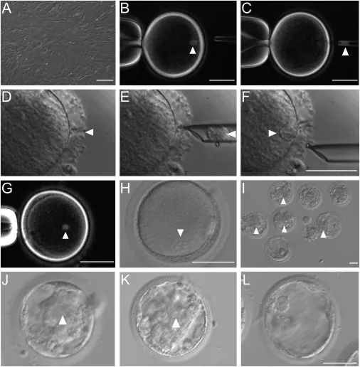 H:用离子霉素和DMAP(4-二甲氨基吡啶)活化重建卵母细胞。所有活化的胚胎显示单原核(箭头位置)。