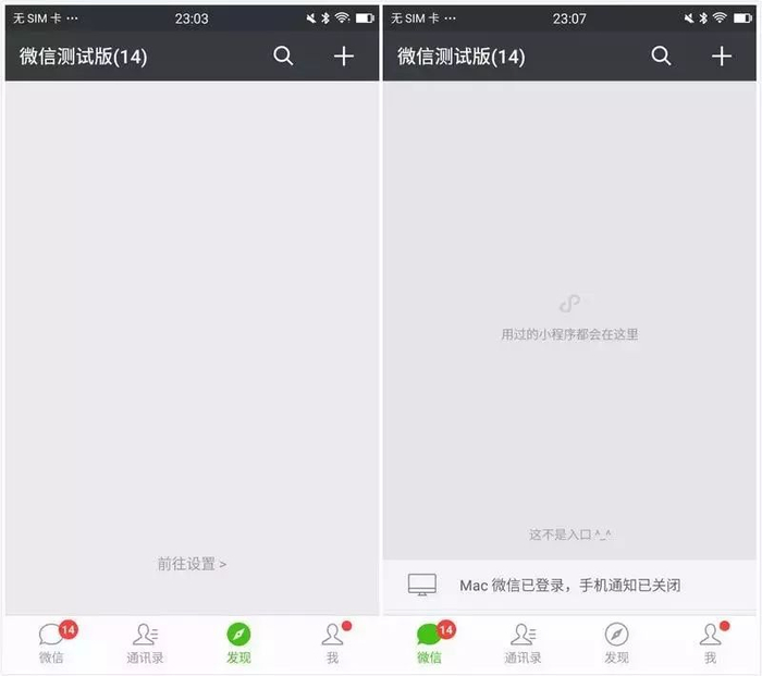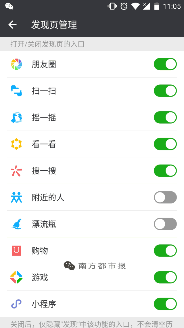 以前,你能关闭“朋友圈”、“摇一摇”、“漂流瓶”等功能,但在内测版中所有标签都可管理、随意开关!“购物”、“游戏”、“小程序”三个标签都可以关闭了!