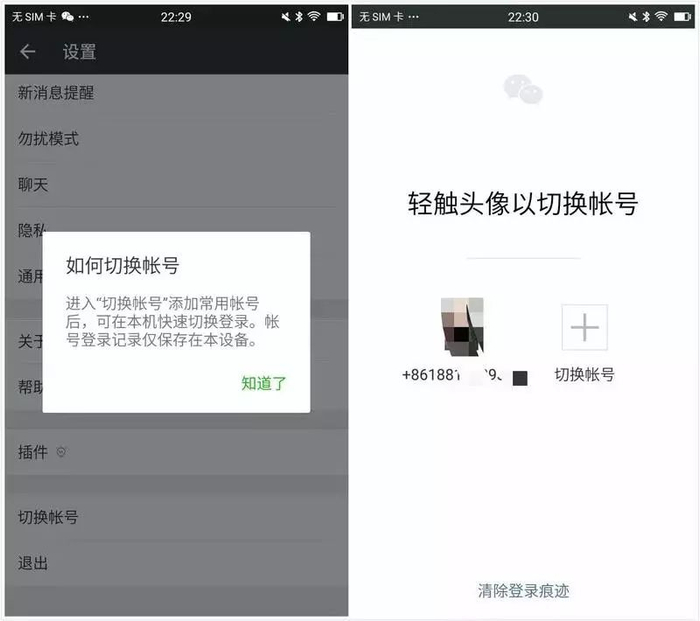 不过,“切换账号”并不能像在电脑上挂QQ一样,可以同时收发消息,在线的只有一个账号。手机切换微信账号时,如果登录了PC版微信客户端,那么该账号也会同步退出。