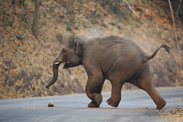 一头奔跑的小象,它把土用鼻子盖在身上为了驱蚊虫叮咬。罗爱东 图