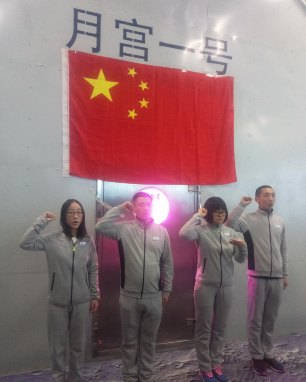 仪式上,曾完成第一阶段为期60天实验的1组志愿者刘慧、刘佃磊、胡静斐、高寒在国旗下宣誓,并在现场全体人员的共同祝福下再次进入实验舱内,他们将完成第三阶段为期105天的实验,今年的春节,这4名志愿者也将在“月宫一号”度过。