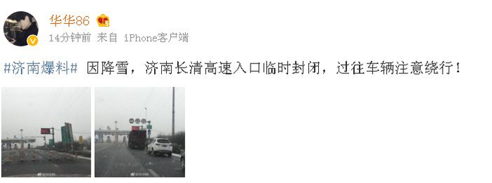 G2001济南绕城高速济南南、济南西收费站,受天气影响,双向入口临时封闭。