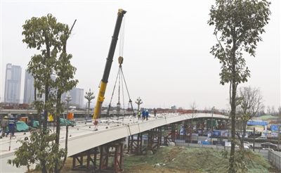 工人正在横跨天府大道的锦城绿道桥上施工 摄影记者 王红强1月26日下午,随着最后一段钢箱梁稳稳落放,横跨天府大道、连接桂溪生态公园东西两侧的绿道桥——“月牙桥”整体合龙。