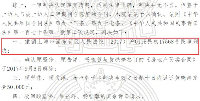 这也是为什么顾姓、杨姓业主二审能和黄晓婷达成和解协议,还向她返还了的定金。小编注意到,判决书内容显示,解除合同的法律依据并非“欺诈”或是“诈骗罪”,而是《合同法》。