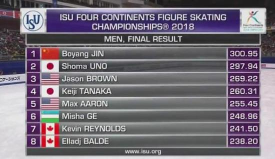 最终金博洋在自由滑中得到200.78分(技术分115.34/节目内容分85.44),在成就了个人总分300.95分的最好成绩只是,他也首次拿到四大洲赛冠军。