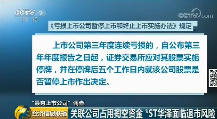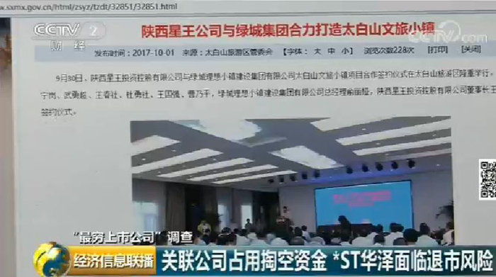 记者 宁坤:这里是西安市的高新区,陕西华泽镍钴金属有限公司的办公地点就在我身后的这栋大楼里。那目前已有两家审计机构正在对ST华泽出现的问题进行专项审计。截至2017年12月,审计调查初步可以确认的关联方占用资金为约13亿元。刚刚这里的工作人员也坦言,公司集团目前整个的资金链情况比较紧张,如果到今年四月份年报结果公布之后,公司持续第三年经营状况为亏损的话,按规定,将面临退市的处置。