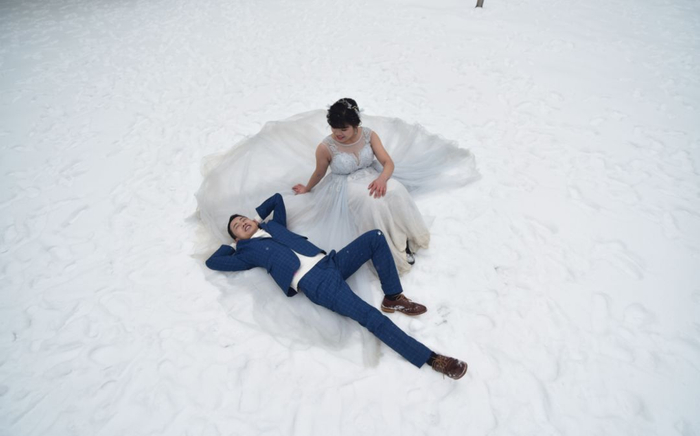 昨日,武汉长江二桥下一对新人在雪地中拍结婚照,新娘穿着薄薄的婚纱美丽冻人。记者詹松 摄