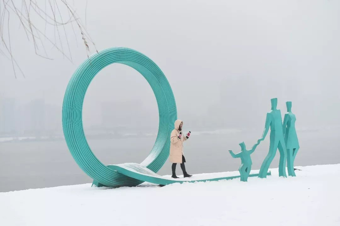 汉口江滩,市民与江边艺术雕塑合影。记者许魏巍 摄