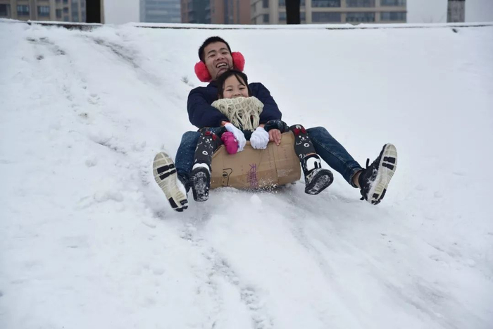 昨日,在汉口江滩,孩子和家长一起借着滑坡玩起雪中滑板。记者詹松 摄
