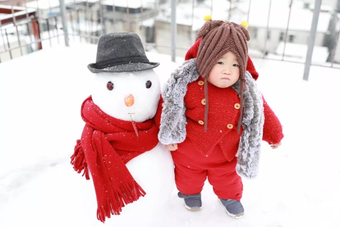 昨天,在武昌司门口一居民楼顶,刚满周岁的果果和雪人宝宝比萌。记者苗剑 摄