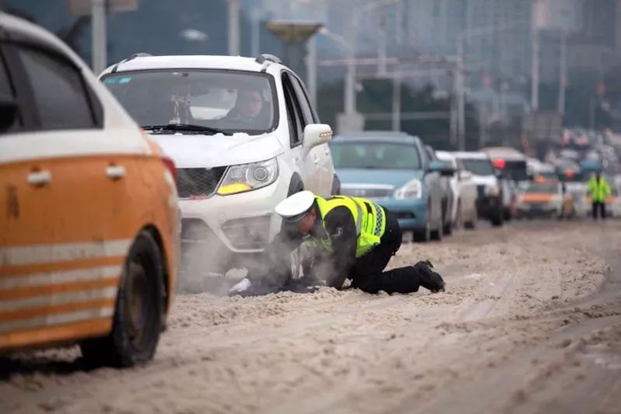 曹勇和15名同事一起,昨天早上7点开始守在这里,配合城管融雪除冰,一台又一台地推出被困车辆。他们从早上一直干到中午12点,饭顾不上吃,水也顾不上喝,一共推车近百台,中途摔了一跤又一跤,爬起来又接着推。有台车因为轮胎太滑实在推不动,他找来一件衣服,自己跪在地上,把衣服铺在轮子底下以增加摩擦力,周围的过路群众都对他竖起大拇指,亲切地喊他“跪地哥”。
