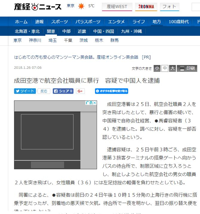 报道是这么说的:虽然这名中国男子否认警方对他的指控,但日本警方坚持认为,该男子因不听劝阻、企图进入机场限行区域内,并导致一名航空公司女性职员“左脚扭伤”。