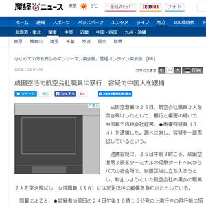 “一名中国籍男子25日在东京成田机场涉嫌对2名航空公司职员施暴,当天已被成田机场警署拘捕。”