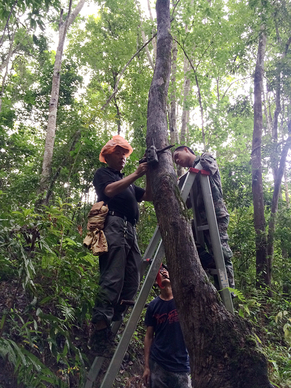 保护区工作人员正在安装检测野象的红外线相机
