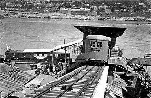 当年,观光缆车屹立在朝天门靠嘉陵江一侧。看着旧照片申发康说,“喏,缆车一共有两个车厢,当年全部都可以开到船边,方便坐船的人上下坡,减少爬坡上坎的辛苦。”
