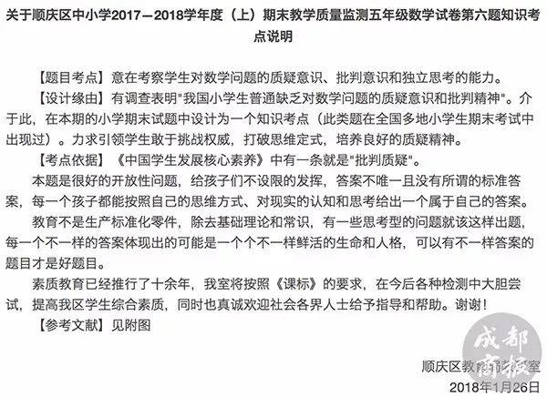说明还称,《中国学生发展核心素养》中有一条就是“批判质疑”,本题是很好的开放性问题,给孩子们不设限的发挥,答案不唯一且没有所谓的标准答案,每一个孩子都能按照自己的思维方式、对现实的认知和思考给出一个属于自己的答案。教育不是生产标准化零件,除去基础理论和常识,有一些思考型的问题就该这样出题,每一个不一样的答案体现出的可能是一个个不一样鲜活的生命和人格,可以有不一样答案的题目才是好题目,“素质教育已经推行了十余年,我室将按照《课标》的要求,在今后各种检测中大胆尝试,提高我区学生综合素质,同时也真诚欢迎社会各界人士给予指导和帮助。”