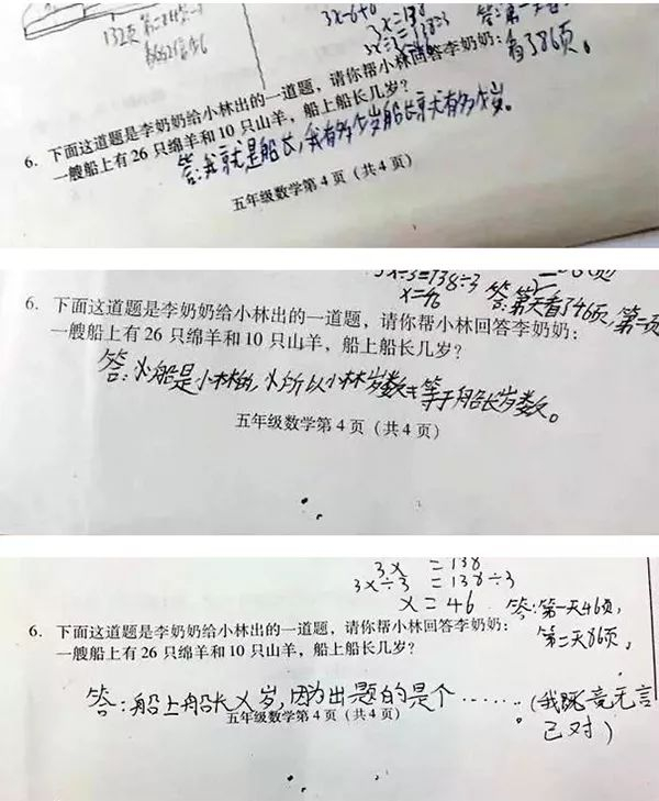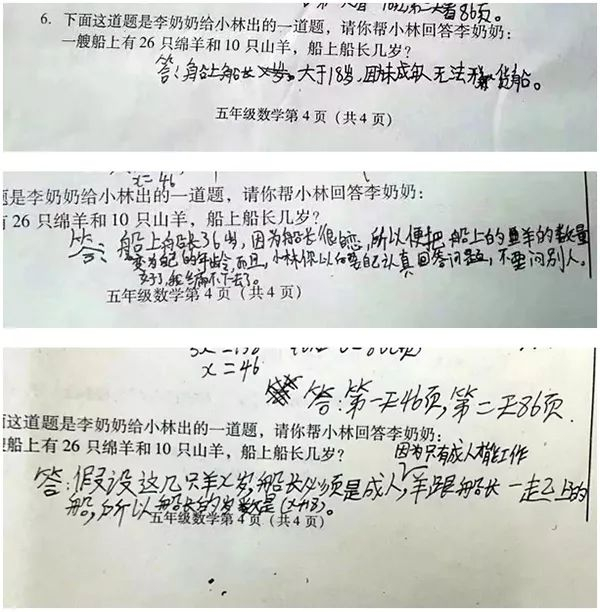 网传图片显示,学生们的回答五花八门,包括“船上船长大于18岁,因为未成年人无法开货船”、“船上船长36岁,因为船长很自恋,所以便把船上的羊的数量便为自己的年龄,而且,小林你以后要自己认真回答问题,不要问别人,好了,我编不下去了”。也有学生一本正经作答:“无法确定,绵羊与山羊的只数与船长的岁数没有关系,求不出来船长的年龄。”