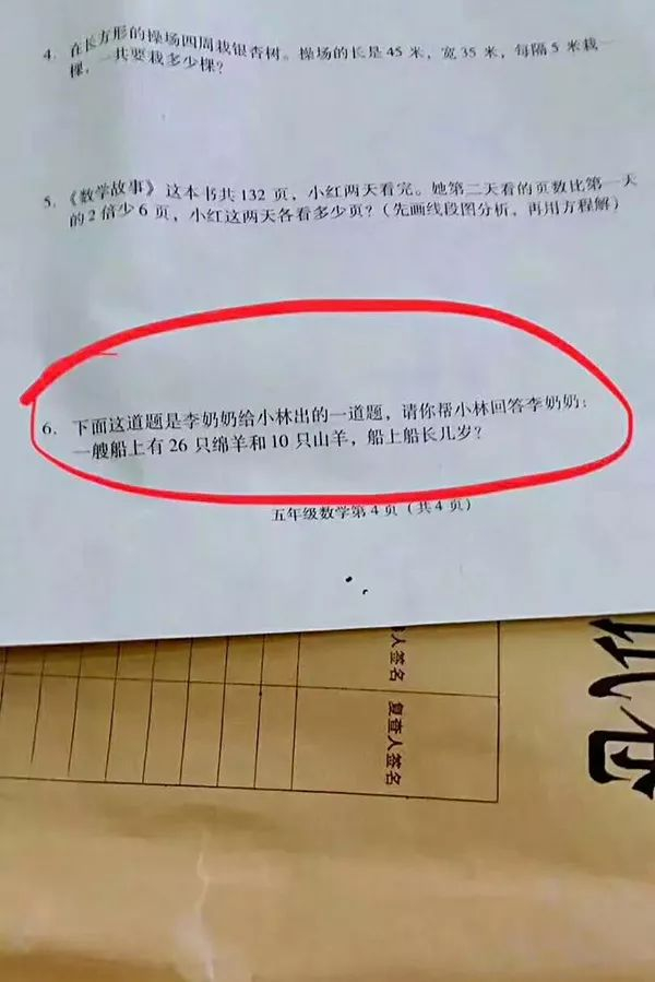 “下面这道题是李奶奶给小林出的一道题,请你帮小林回答奶奶:一艘船上有26只绵羊和10只山羊,船上船长几岁?”