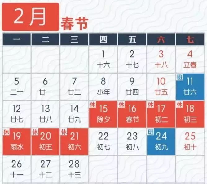 2018年2月15日至21日放假调休,共7天。2月11日(星期日)、2月24日(星期六)上班。