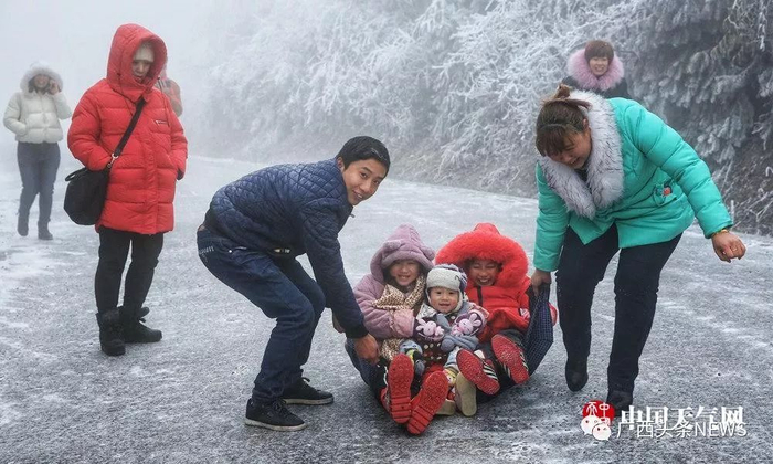 受强冷空气入境影响,桂林资源县隘门界气温降至零下4℃,“冻”感十足,出现了雨凇、雾凇美景,银装素裹的景象,吸引了不少游客和摄影爱好者冒着寒风细雨慕名前来观赏游玩,一些游客还利用伞布载着孩子们在雪地上滑行,玩得不亦乐乎。