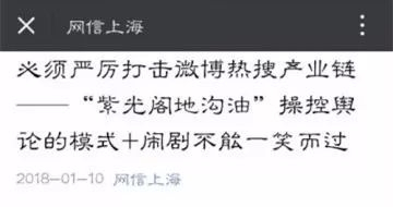 1月10 日,上海网信办发文称,不能忽视近日因某艺人粉丝引起的“紫光阁地沟油”操控舆论的模式+闹剧,并认为造谣言、买热搜、疯狂举报、绑架社会舆论等娱乐资本操纵舆论方式,已是严重的社会现象,指出要严打在微博平台发生的热搜产业链。