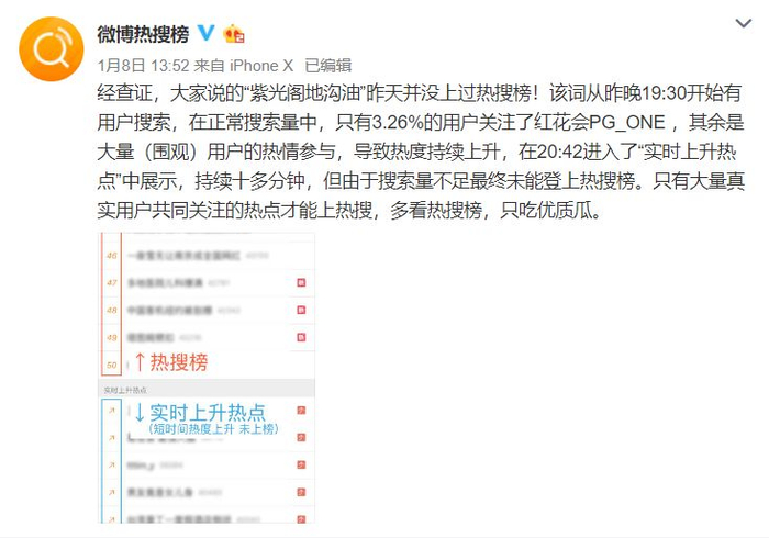 1月7日晚,有网友发现在微博热搜榜上出现了“紫光阁地沟油”一词。