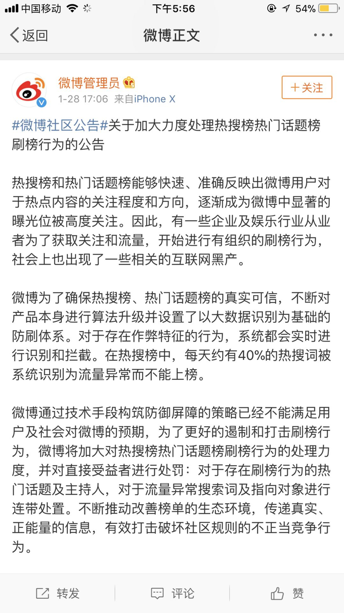 微博官方发文《关于加大力度处理热搜榜热门话题榜刷榜行为的公告》。公告表示相关明星、节目、事件名称3个月不能上热搜榜,李小璐、周笔畅、宋小宝等在列。