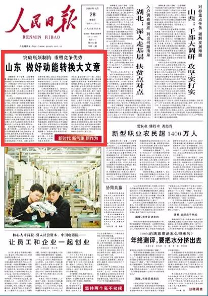 1月28日出版的《人民日报》头版头条刊登《山东 做好动能转换大文章(新时代 新气象 新作为)》一文,点赞山东突破瓶颈制约,重塑竞争优势。