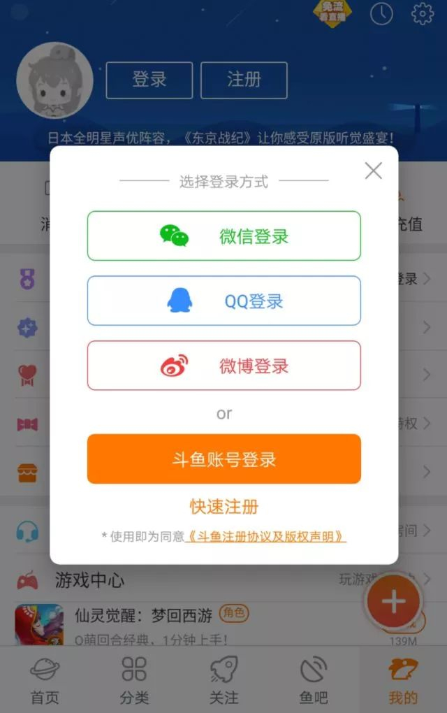 中级套路:使用即是同意。在斗鱼直播APP的注册界面,其下方也有一行小字提示“使用即为同意《斗鱼注册协议及版权声明》”,明确表示用户使用该软件即为同意其用户协议;