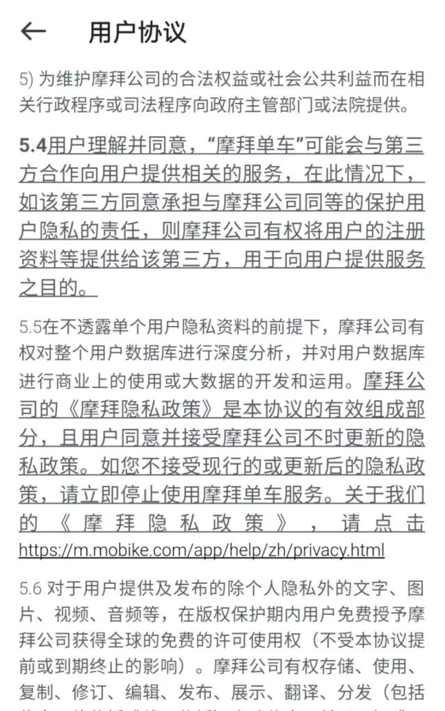 高级套路:同意即意味着“授权”泄露。在摩拜单车APP的《用车服务条款》近万字说明中,5.4条约定:“用户理解并同意……则摩拜公司有权将用户的注册资料等提供给第三方……”用户一旦使用该APP,即“授权”将自己的注册信息出让给第三方。