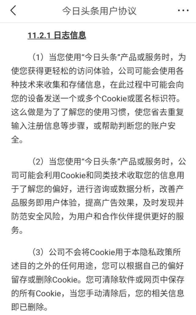 点开该协议内容,在11.2.1日志信息中介绍了该APP对用户cookies(用户上网痕迹,包含浏览历史、账号、密码等敏感内容)的使用说明,其中明确表示:“该公司可能会利用cookie和同类技术收取您的信息用于了解您的偏好……为用户和合作伙伴提供更好的服务。”