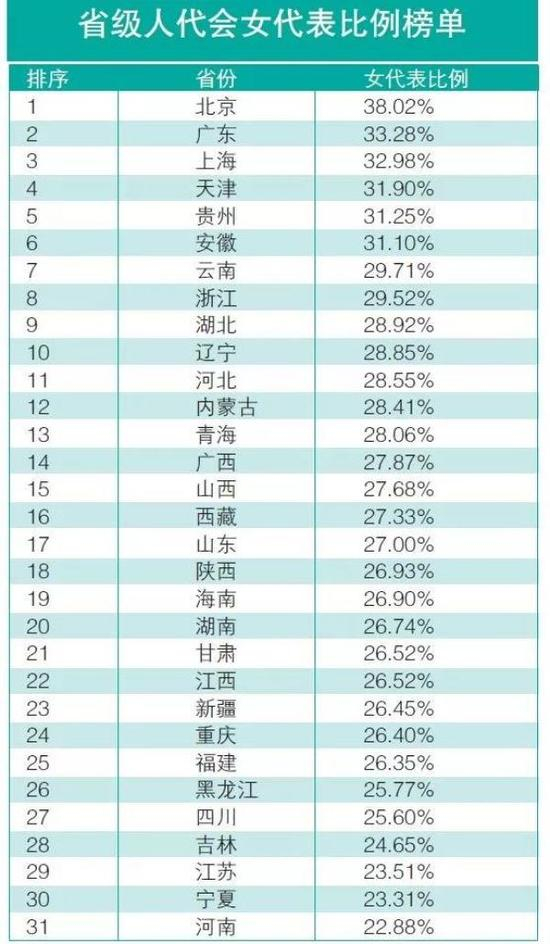 省级人大代表中女性比例,北京市位居第一;