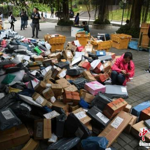 随着2017年“双十一”的结束,重庆一高校内快递包裹已经开始“堆积如山”。 陈超 摄
