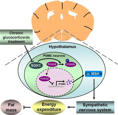 该研究发现SGK1/FOXO3信号在下丘脑POMC神经元中调节糖皮质激素引起的肥胖的重要功能,为了解糖皮质激素与脂肪异常堆积之间的关系提供了新的见解与思路,也提示下丘脑中SGK1/FOXO3信号可能是治疗肥胖以及相关代谢性疾病新的潜在药物靶点。