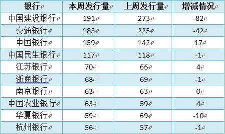 建设银行、交通银行及中国银行跃居理财产品发行量前三名。其中,建设银行发行191只产品,较上周减少82只产品;交通银行发行183只理财产品,较上周减少42只;中国银行发行159只产品,较上周增加17只。值得关注的是,本周排名前十的银行产品发行量较上周有所减少。