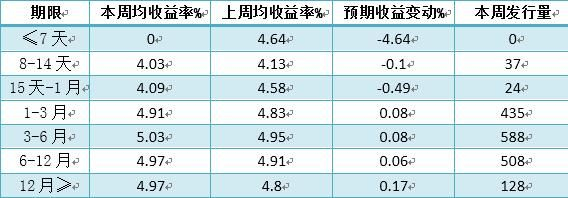 本周无7天以内的理财产品;8天至14天期限的产品共有37款,平均预期年化收益率达4.03%;15天至1月期限的产品共有24款,平均预期年化收益率达4.09%;1-3个月期限的产品共有435款,平均预期年化收益率达4.91%;3-6个月期限的产品共发行588款,平均预期年化收益率达5.03%;6-12个月期限的产品共发行508款,平均预期年化收益率达4.97%;12月以上期限的产品共有128款,平均预期年化收益率达4.97%。