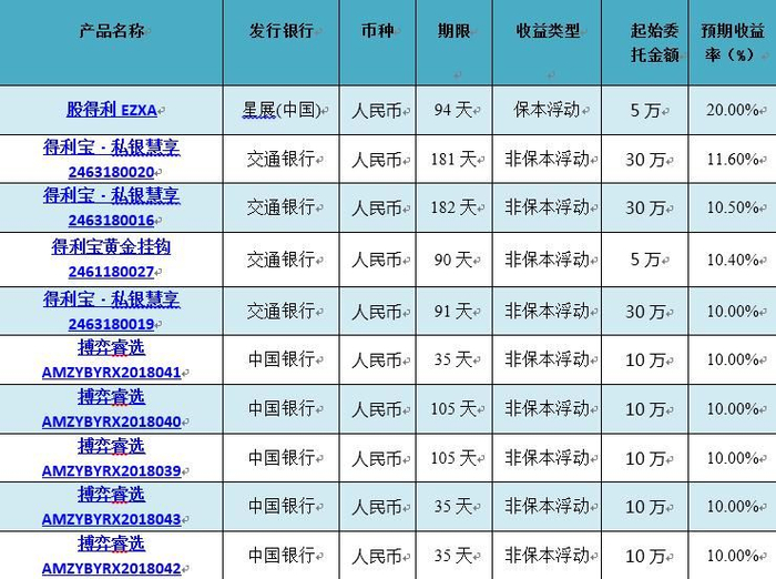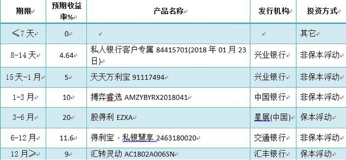 不同期限的预期收益率之最产品,多为非保本浮动型产品。其中,兴业银行的一款产品《私人银行客户专属84415701(2018年01月23日)》以4.64%的预期收益率占据了8天至14天期限的首位;兴业银行的一款产品《天天万利宝91117494》以5%的预期收益率占据了15天至1个月期限的首位;中国银行的一款产品《搏弈睿选AMZYBYRX2018041》以10%的预期收益率占据了1个月至3个月期限的首位;星展(中国)的一款产品《股得利EZXA》以20%的预期收益率占据了3个月至6个月期限的首位;交通银行的一款产品《得利宝•私银慧享2463180020》以11.6%的预期收益率占据了6个月至12个月的首位。汇丰银行的一款产品《汇转灵动AC1802A006SN》以9%的预期收益率占据了12个月以上期限的首位。