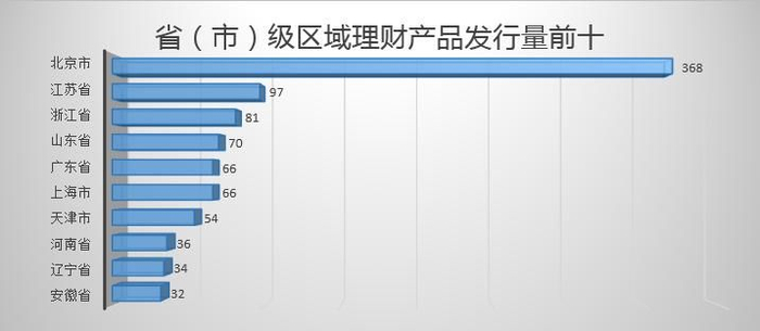 本周,北京发行量368款,环比上周少发29只;江苏省以97只产品位列第二,但与首位发行量相差悬殊;浙江省发行81只产品位居第三。从前十分布区域来看,大部分集中在沿海经济发达地区和一线城市。